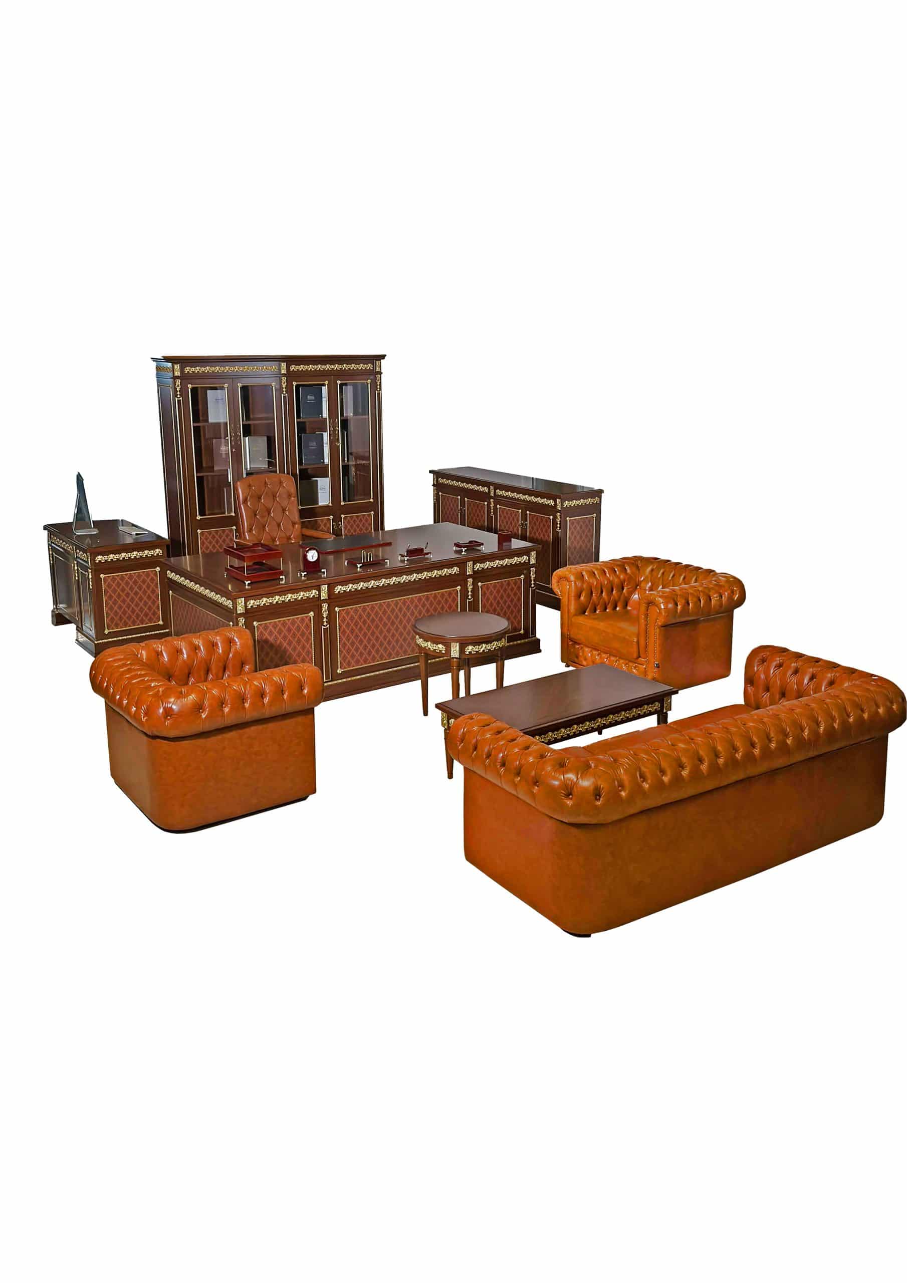 يشمل ( مكتب + ملحق جانبي + دولاب +كردينزا + طاولة شاي 60 سم + طاولة شاي 120 سم )